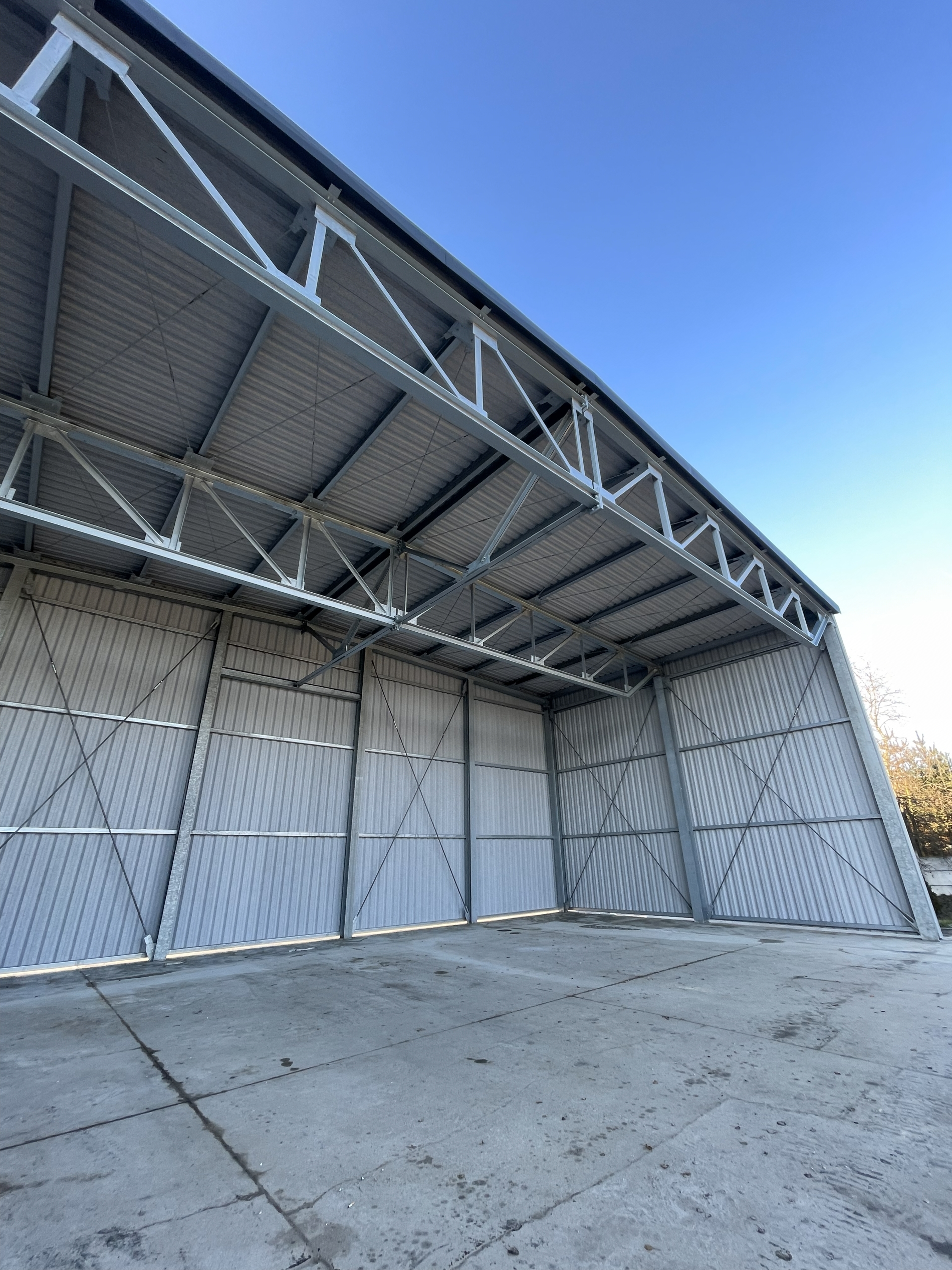 Realizacja wiaty/magazynu z ciemnej blachy falistej na stalowej konstrukcji nośnej.