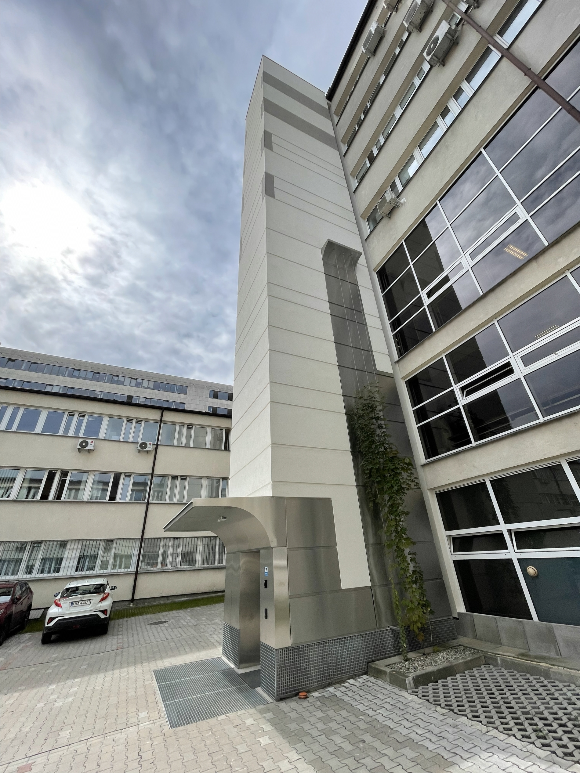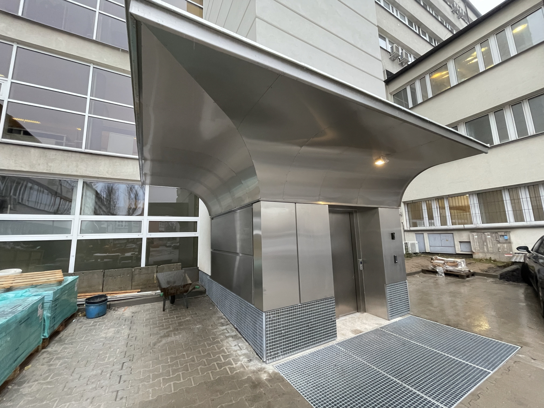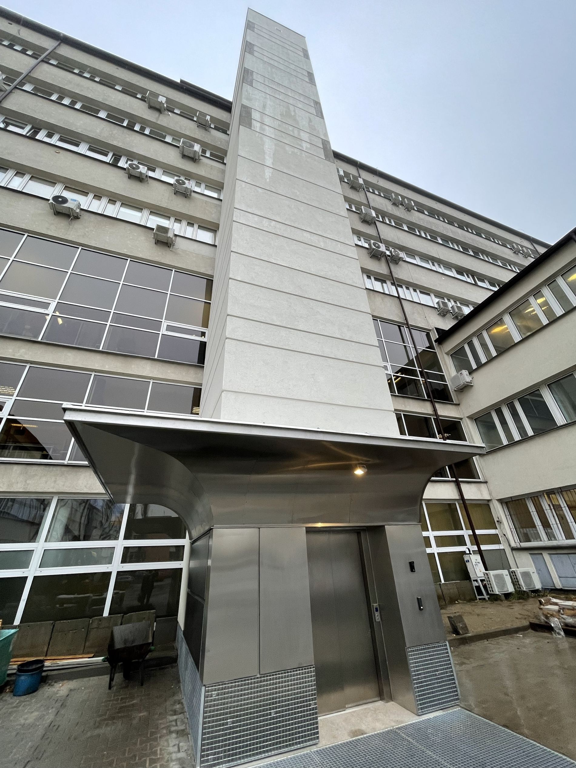 Skomplikowana realizacja konstrukcji szybu windy przy budynku wielokondygnacyjnym wraz z wykończeniem wnętrza kabiny.
